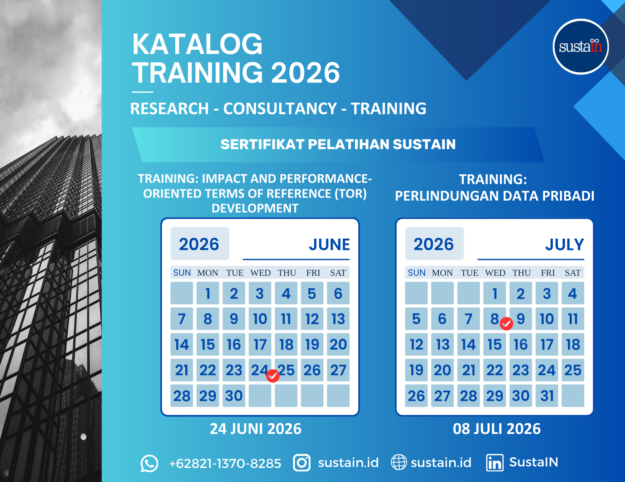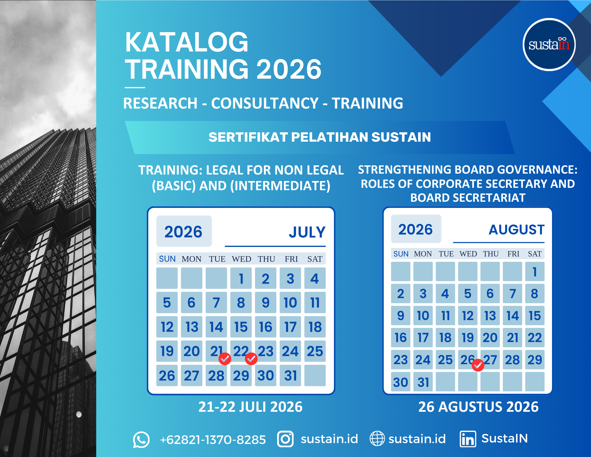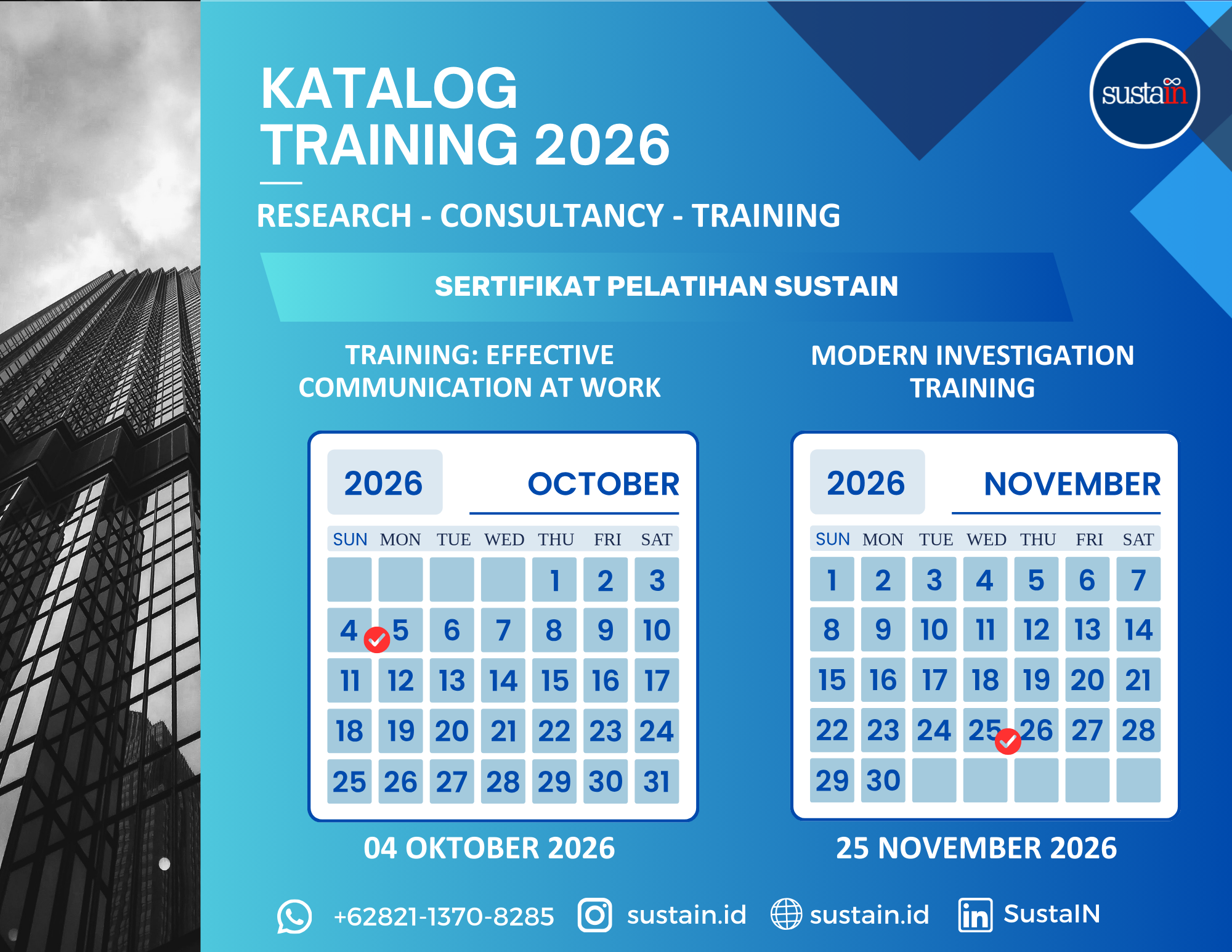 SustaIN adalah perusahaan konsultan yang fokus pada riset, konsultasi, dan training. Dalam kegiatan training, SustaIN memiliki lebih dari 40 program pelatihan yang diantaranya adalah mengenai Good Governance, Corporate Management, Legal/Compliance, Communication dan Individual/Organisational Capacity Development seperti Training for Trainer (TFT), Training untuk Fasilitator. Untuk informasi lengkap mengenai daftar pelatihan yang SustaIN selenggarakan, silakan unduh jadwal pelatihan kami berikut. Untuk appointment 30 – 60 menit Training Need Analysis (TNA) silakan beremail ke contact@sustain.id atau hubungi kami melalui Whatsapp +62 821-1370-8285.